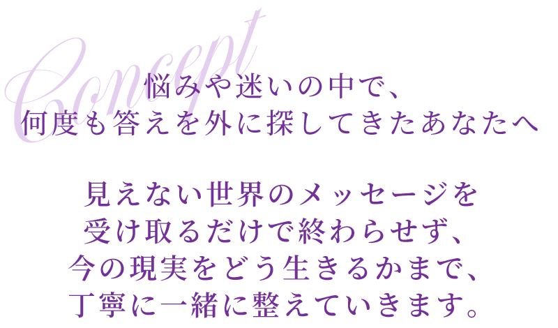人生の主役は自分自身であることを思い出し、現実逃避ではなく現実をしっかり生きるために心を整え、精神性と霊性を育てながら自分の足で人生を歩いていけるよう依存を生まない関わりを大切にし、ただ答えを得て終わりではなく伴走するような気持ちでお手伝いしています。